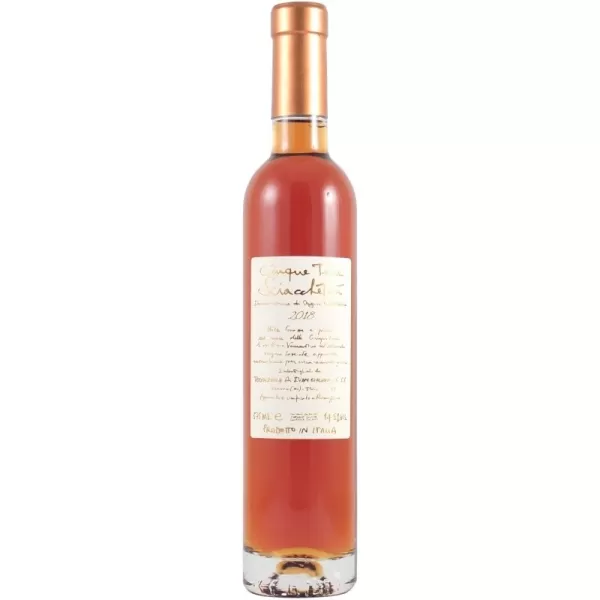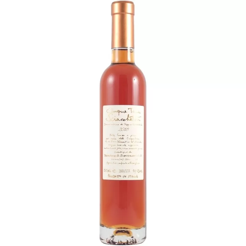 Lo Sciacchetrà Cinque Terre DOC 2018 è un vino passito ligure, uno dei simboli della Liguria perché è caratterizzante proprio del territorio in cui nasce: i vigneti di uva Bosco, Albarola e Vermentino con cui si fa lo Sciacchetrà si inerpicano su per le colline partendo dal mare, dando vita a quell'affascinate e unico paesaggio dei terrazzamenti con i muretti di pietre a picco sull'acqua.